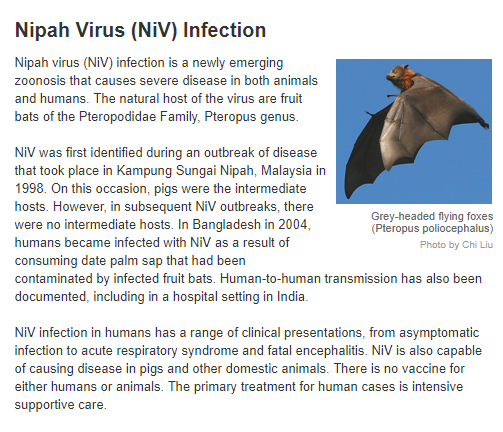 निपाह वायरस हा मुख्यतः वाटवाघुळापासून निर्माण झालेला आहे. १९९८ मध्ये सर्वात प्रथम मलेशियामध्ये हा वायरस सापडला होता. मलेशियामधील डुक्कर प्राण्यांमध्ये सर्वात प्रथम हा वायरस आढळून आला होता. यानंतर यावर संशोधन सुरु करण्यात आले होते. या संशोधनानुसार फळे खाणारी वटवाघुळे अर्थात फ्रुट बॅट्स हे या विषाणूचे मूळ वाहक आहेत. निपाहग्रस्त वटवाघुळाने एखादे फळ खाल्ल्यास त्या उष्ट्या फळापासून इतर प्राण्यांना व त्यानंतर माणसांना या रोगाची लागण होते. मलेशियामध्ये यामुळे काही प्राणी दगावल्याचे देखील समोर आले होते. त्यानंतर २००१ ते २००४ मध्ये बांगलादेशामधील काही नागरिकांना या वायरसची लागण झाली होती. यामुळे बांगलादेशामध्ये तब्बल ५० जणांना आपला प्राण गमवावा लागला होता. त्यानंतर भारतामध्ये काही ठिकाणी देखील रोगाची लागण झाल्याची काही प्रकरणे समोर आलेली होती.