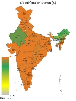 * देशभरात आतापर्यंत २१ कोटी ११ लाख घरांमध्ये (९९ %) विद्युतीकरण झाले आहे. तर उर्वरित १३ लाख घरांपर्यंत वीज पोहचविणे सुरु आहे. देशात सौभाग्य योजनेंतर्गत ऑक्टोबर २०१७ पासुन डिसेंबर २०१८ पर्यंत २ कोटी ४८ लाख घरांना वीज जोडणी दिली गेली.