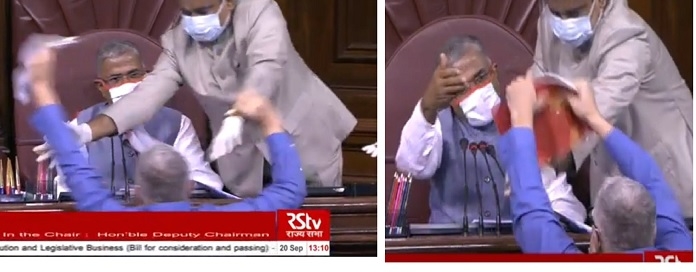 यापूर्वी मतदानावेळी सदनात गोंधळ सुरू होता. विरोधी पक्षातील खासदारांनी वेलमध्ये येत घोषणाबाजी केली. तृणमुल खासदार डेरेक ओ’ब्रायन यांनी उपसभापती हरिवंश यांचा माईक तोडण्याचा प्रयत्न केला. त्यांनी सदनाची नियमावली पुस्तिका फाडून टाकली. सदनाची कार्यवाही सुरू ठेवण्यासाठी मार्शलांना पाचारण करण्यात आली आहे. दहा मिनिटांसाठी कार्यवाही स्थगित केल्यानंतर पुन्हा मतदान प्रक्रीया सुरू झाले. विरोधी पक्षांच्या गोंधळातच सरकारला बिल पारीत करावे लागले.