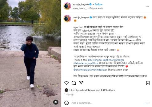 "काल स्वतःला प्रमुख भूमिकेत मोठ्या पद्द्यावर पाहिलं. rejection ला मी घाबरत नाही ना मनाला लाऊन घेत. पण एक rejection मनाला खूप लागलं होतं. आणि मग self doubt मनात निर्माण झाला. आपण चित्रपटात प्रमुख भूमिका साकारण्यास सक्षम नाही आहोत का ?? खरंतर माझं हे स्वप्न नव्हतंच कधी पण “आपण चित्रपटाची heroin होऊ शकत नाही” ह्याची जाणिव करुन दिल्यावर मात्र माझ्या स्वभावानुसार मनात आलं आता हे करायलाच हवं. माझ्या मनात स्वप्न पेरल्या बद्दल त्यांचे आभार “लंडन मिसळ” नायिका/नायक म्हणून माझा पहिला चित्रपट," अशी पोस्ट ऋतुजाने करत तिच्या भावना व्यक्त केल्या.