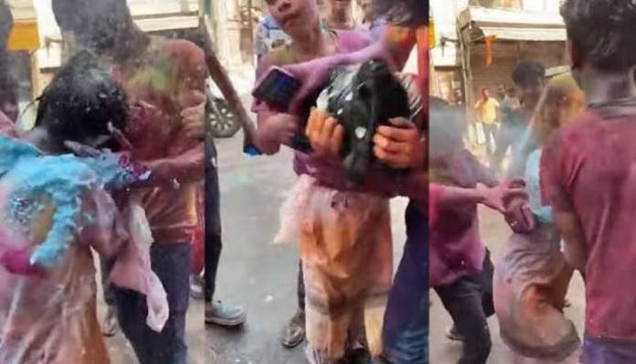 सोशल मीडियावर ‘व्हायरल’ होत असलेल्या व्हिडिओमध्ये काही तरुण होळीच्या दिवशी रंग खेळताना दिसत आहेत. यातील तीन ते चार तरुणांनी जपानी मुलीच्या अंगाला जबरदस्तीने रंग लावताना व्हिडिओत दिसत आहे. हा व्हिडिओ अनेकांनी शेअर केला असून संतप्त प्रतिक्रियाही व्यक्त केल्या आहेत.