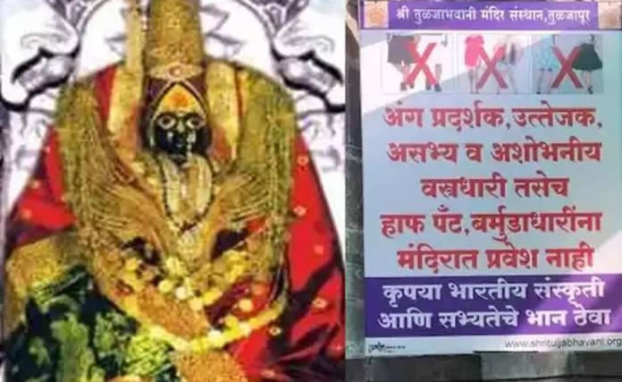 मुंबई : महाराष्ट्राची कुलस्वामिनी असलेल्या तुळजाभवानी मातेच्या दर्शनाला जाणाऱ्या भक्तांसाठी एक नियमावली बनवण्यात आली आहे. मंदिरात दर्शनासाठी जाणाऱ्या भाविकांच्या वस्त्राबाबत प्रशासनाने निर्णय घेतला असून असभ्य आणि अशोभनीय वस्त्रे परिधान करून येणाऱ्यांना मंदिरात प्रवेश करता येणार नाही, या आशयाचा फलक मंदिर परिसरात गुरुवारी लावण्यात आला आहे. त्यामुळे आता मंदिरात दर्शनासाठी महाराष्ट्र आणि देशभरातून येणाऱ्या भक्तांसाठी नवी ड्रेसकोडची नियमावली करण्यात आली असून त्याचे पालन भाविकांना करावे लागणार आहे. दर्शनासाठी येणाऱ्या भक्तांनी जर बरमोडा, हाफ पॅन्ट, उत्तेजक कपडे तसेच अंग प्रदर्शन करणारे कपडे घातले असतील तर त्यांना मंदिरात प्रवेश मिळणार नाही, असे फलकावर स्पष्टपणे लिहिण्यात आले आहे.