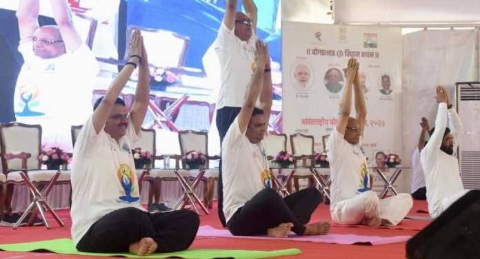 मुंबई : जगभरातील १८० देशांनी मान्यता दिलेला आंतरराष्ट्रीय योगदिवस महाराष्ट्रात मोठ्या उत्साहात आणि ऊर्जदायक वातावरणात पार पडला. महाराष्ट्राचे राज्यपाल रमेश बैस, मुख्यमंत्री एकनाथ शिंदे आणि उपमुख्यमंत्री देवेंद्र फडणवीस यांच्यासह इतर मान्यवरांच्या विशेष उपस्थितीत विधान भवनाच्या प्रांगणात बुधवारी सकाळी योगासनाची प्रात्यक्षिके सादर करण्यात आली. यावेळी फडणवीस शिंदेंसह राज्यपालांनी योगदिनाचे महत्त्व विशद करत योगासने करण्याचे आवाहन उपस्थितांना दिले.