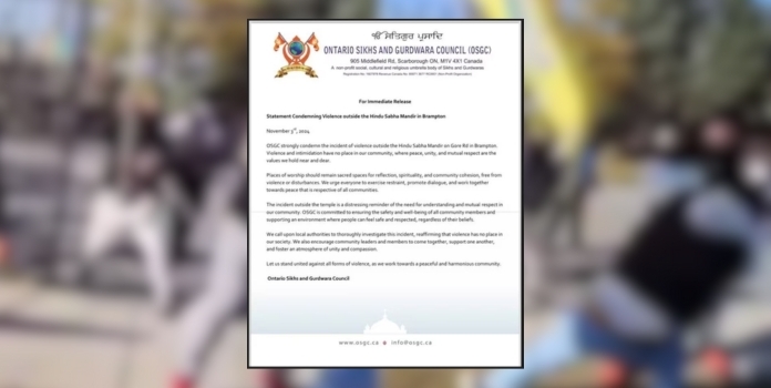 ओंटारियो शिख एण्ड गुरूद्वारा कौन्सिलच्या पत्रकात म्हटले आहे की, शीख समुदायात हिंसा आणि धमक्या यासारख्या गोष्टींना स्थान नाही. सर्वांमध्ये शांतता, एकता असावी आणि प्रत्येकाने एकमेकांचा आदर केला पाहिजे. श्रद्धेचे ठिकाण हे हिंसाचाराचे आणि अशांततेचे ठिकाण नाही. ते एक पवित्र स्थान आहे. अध्यात्म आणि सर्वांच्या समान चिंतनासाठी ते बाजूला ठेवले पाहिजे. आम्ही आवाहन करतो की प्रत्येकाने संयमाने वागावे, सर्व समाजाचा आदर केला पाहिजे आणि यासाठी एकत्र काम करावे. सर्वांनी संघटित होऊन अशा घटकांविरुद्ध आवाज उठवावा, असे आवाहनही शीख समुदायाने समाजाला केले आहे. असे केल्यानेच शांततामय समाजाची स्थापना होऊ शकते.