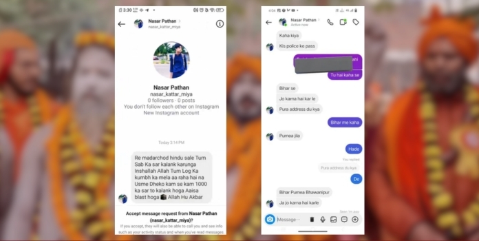 व्हायरल झालेल्या पोस्टनुसार नासर पठाण नावाने चालणाऱ्या एका आयडीवरून दुसऱ्या व्यक्तीला मेसेज पाठवण्यात आल्याचे दिसत आहे. त्यामध्ये हिंदूंच्या भावना भडकवणारा आशय लिहिल्याचे पाहायला मिळत आहे. नासर पठाण हा बिहारच्या पूर्णिया येथील भवानीपूर गावचा रहिवासी असल्याचेही कळत आहे. सध्या प्रयागराज व बिहार पोलिसांकडे कारवाईची मागणी करण्यात आली आहे. उत्तर प्रदेश सरकारने महाकुंभाच्या सुरक्षेसाठी ३५ हजारहून अधिक पोलीस आणि होमगार्ड कर्मचारी तैनात केले आहेत. महाकुंभ परिसरात ५६ चौक्या तयार करण्यात आल्या आहेत. संपूर्ण परिसर कॅमेऱ्यांनी सुसज्ज आहे.