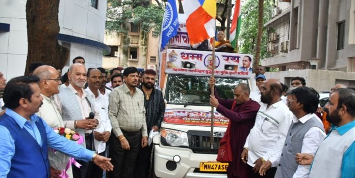 मुंबई : बुध्दगया येथील महाबोधी महाविहार हे बौध्दांचे जागतिक सर्वोच्च श्रध्दास्थान आहे.महाबोधी महाविहार हे बौद्धांच्या ताब्यात आलेच पाहिजे.महाबोधी महाविहार मुक्तीसाठी मुंबईत येत्या 14 ऑक्टोबर रोजी आझाद मैदानात आयोजित केलेल्या मोर्चात सर्व गटतट विसरुन सर्व आंबेडकरी बौध्द जनतेने लाखोंच्या संख्येने सामील व्हावे. बौध्दांनी या शांततापूर्ण विराट मोर्चात आपली ताकद दाखवावी असे आवाहन रिपब्लिकन पक्षाचे राष्ट्रीय अध्यक्ष केंद्रीय सामाजिक न्याय राज्यमंत्री ना.रामदास आठवले यांनी केले आहे. बांद्रा येथे महाबोधी महाविहार मुक्ती मोर्चाच्या प्रसारासाठी साकार करण्यात आलेल्या धम्मरथाचे उद्घाटन ना.रामदास आठवले यांच्या हस्ते बांद्रा येथे आज झाले. त्यावेळी ना .आठवले बोलत होते. यावेळी रिपब्लिकन पक्षाचे राष्ट्रीय सरचिटणीस अविनाश महातेकर,राज्य सरचिटणीस गौतम सोनावणे, मुंबई अध्यक्ष सिद्धार्थ कासारे; धम्म रथाचे संयोजक उत्तर मुंबई जिल्हा अध्यक्ष रमेश गायकवाड,भदंन्त शांतीरत्न थेरो युवक आघाडी मुंबई अध्यक्ष सचिनभाई मोहिते आदी अनेक मान्यवर उपस्थित होते.