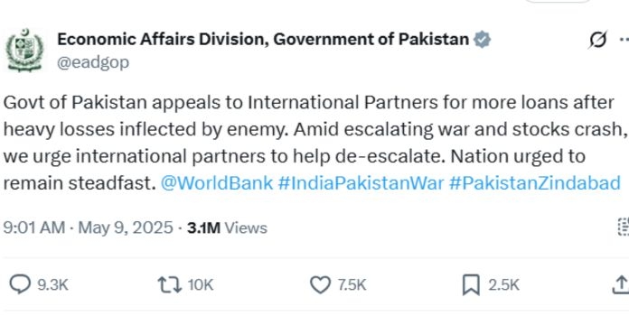 कराची : आधीच उल्हास त्यात फाल्गुन मास, अशी पाकिस्तानची अवस्था होताना दिसत आहे. भारत आणि पाकिस्तान यांच्यातील युद्धामुळे पाकिस्तानला मोठे नुकसान झाले आहे. यामुळे पाकिस्तान सरकारने जगभरातील देशांकडून आर्थिक मदत मागितली आहे. पाकिस्तानी सरकारचा आर्थिक व्यवहार विभागाने एक्स पोस्ट करत ही मागणी केली आहे. युद्धामुळे आमच्या देशाची अर्थव्यवस्था कोलमडली आहे. अनेक ठिकाणी नुकसान झाले आहे, आणि सरकारकडे पैसा कमी आहे. त्यामुळे आम्ही संयुक्त राष्ट्र , आणि इतर देशांकडे मदतीसाठी विनंती केली आहे.