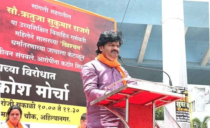 सासरच्या मंडळींकडून धर्मांतर करण्यासाठी टाकण्यात आलेल्या दबावाला कंटाळून सांगलीतील ऋतूजा राजगे या ७ महिन्यांच्या गर्भवती महिलेने आत्महत्या केली. या घटनेच्या निषेधार्थ रविवार, २२ जून रोजी अहिल्यानगरमध्ये 'शक्ती ऋतुजा' मोर्चा आयोजित करण्यात आला होता. यावेळी ते बोलत होते. यावेळी आमदार संग्राम जगताप, सामाजिक कार्यकर्त्या वर्षा डहाळे तसेच सर्व सकल हिंदू समाज बांधव मोठ्या संख्येने उपस्थित होते.