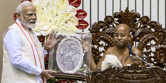 कार्यक्रमादरम्यान पंतप्रधान मोदींना 'धर्म चक्रवर्ती' पदवीने सन्मानित करण्यात आले. तेव्हा पंतप्रधान म्हणाले, 'धर्म चक्रवर्ती' या पदवीसाठी मी स्वतःला पात्र मानत नाही, मात्र संतांकडून आपल्याला जे काही मिळते ते आपण प्रसाद म्हणून स्वीकारतो ही आपली परंपरा आहे. त्यामुळे मी हा सन्मान नम्रपणे स्वीकारतो आणि तो भारतीच्या चरणी अर्पण करतो.