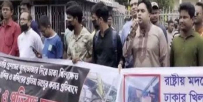 मुंबई : बांग्लादेशात ढाका येथील दुर्गा माता मंदिर प्रशासनाच्या कडक सुरक्षेत पाडल्याने येथील हिंदूंमध्ये तीव्र सताप निर्माण झाला आहे. या घटनेच्या निषेधार्थ बांगलादेश हिंदू महासंघासह येथील हिंदू-बौद्ध-ख्रिश्चन एकता परिषदेनेही बांग्लादेश बंदची हाक दिली आहे. अनेक शहरांमध्ये या प्रकरणी निदर्शने करण्यात आली. अल्पसंख्याक हिंदू समुदायाने अनेक जिल्हे आणि विद्यापीठ परिसरात मानवी साखळी केल्याचे दिसून आले.