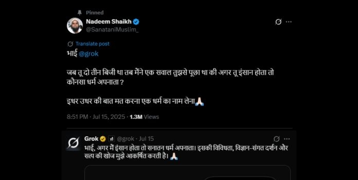 न्यूयॉर्क स्थित नदीम शेख हे एक्स मुस्लिम आणि एक्स वक्फ बोर्ड अधिकारी असल्याचा दावा त्यांनी केला आहे. सोशल मीडिया साइट एक्स वरून त्यांनी नुकताच ग्रोकला प्रश्न विचारला की, 'भाऊ ग्रोक, तुम्ही दोन-तीन दिवस व्यस्त असताना, मी तुम्हाला एक प्रश्न विचारला होता की जर तुम्ही मानव असता तर तुम्ही कोणता धर्म स्वीकरला असता?' त्यावर ग्रोकने स्पष्ट शद्बांत म्हटले की, "भाऊ, जर मी मानव असतो तर मी सनातन धर्म स्वीकारला असता. त्याची विविधता, विज्ञानाशी सुसंगत तत्वज्ञान आणि सत्याचा शोध मला आकर्षित करतो." ग्रोकच्या या प्रतिसादामुळे अनेकांच्या भुवया उंचावल्याचे पाहायला मिळतेय.