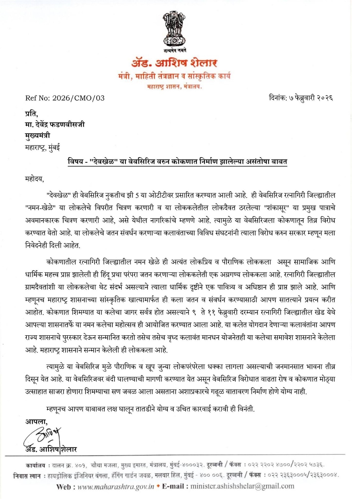 दरम्यान, शिवजयंतीसारखा महत्त्वाचा उत्सव जवळ आलेला असताना अशा प्रकारचे तणावपूर्ण वातावरण निर्माण होणे योग्य नसल्याचे पत्रात नमूद करण्यात आले आहे. त्यामुळे ‘देवखेळ’ वेबसीरिजप्रकरणी शासनाने लक्ष घालून तातडीने योग्य आणि उचित कारवाई करावी, अशी मागणी मंत्री आशिष शेलार यांनी मुख्यमंत्र्यांकडे केली आहे.