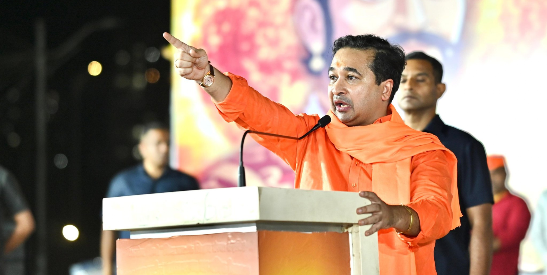पुढे ते म्हणाले, "माझ्या मुंब्रादेवीच्या प्रत्येक हिंदू समाजाला जे जे माझे भाषण ऐकत आहेत त्यांना आम्हाला विश्वास द्यायचे आहे की, तुम्ही कसलीही चिंता करू नका. तुम्ही एकटे नाहीत. तुम्हाला कोणी काही धमक्या देत असेल, कोणी वाकड्या नजरेने बघत असेल तर फक्त आम्हाला सांगा. फक्त रिव्हर्स मारून बुलडोझर मुंब्य्रात फिरवायचा बाकी काही नाही.".